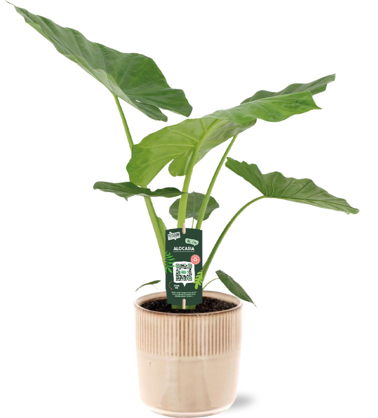 • Die Alocasia ist eine tropische Pflanze mit großen, auffälligen Blättern, die eine tiefgrüne Farbe haben. Die Blätter sind herzförmig und haben oft eine glänzende Oberfläche. Einige Sorten zeigen ein Muster von helleren Adern. Die Pflanze hat lange, schlanke Stängel und kann eine beeindruckende Höhe erreichen. Blüten kommen selten vor, aber die Pflanze ist vor allem für ihr wunderschönes Laub bekannt.