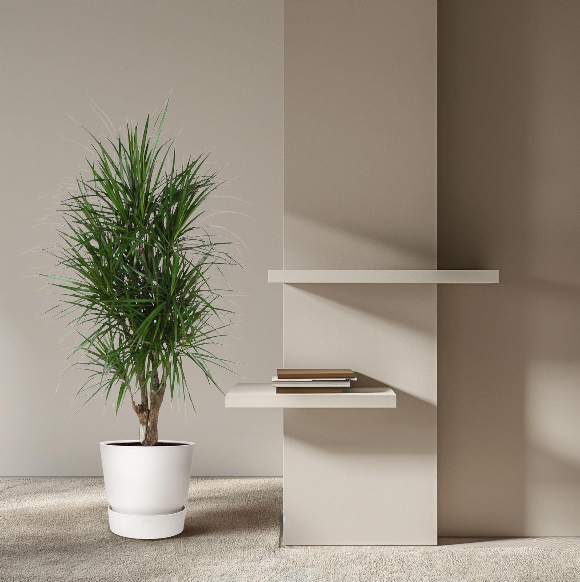- Die Dracaena Marginata ist eine elegante Pflanze mit schlanken, schwertförmigen Blättern, die grün sind und feine rote Ränder haben. Die Blätter wachsen an langen, dünnen Stängeln, die zum anmutigen und modernen Erscheinungsbild der Pflanze beitragen.