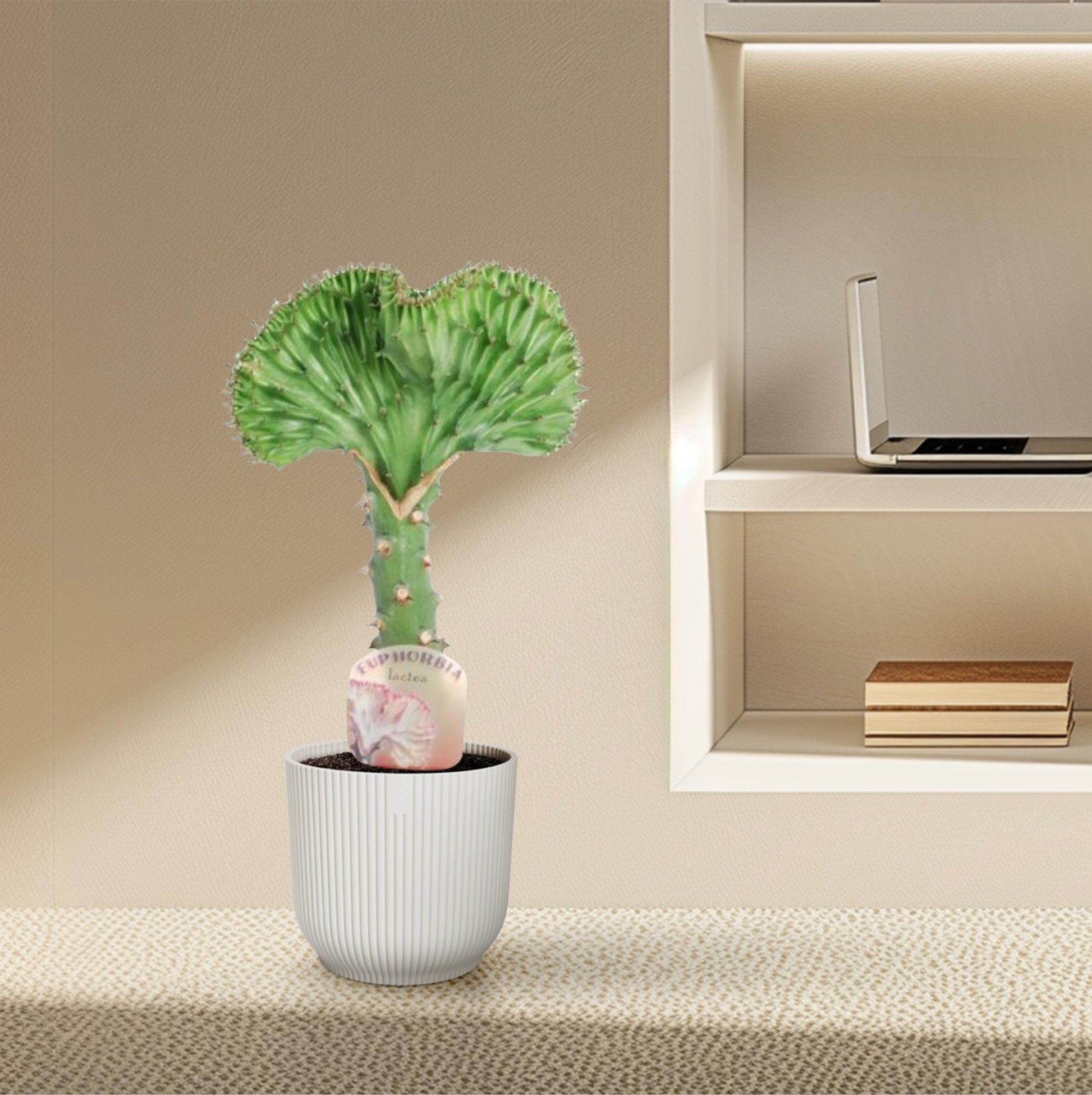 - Die Euphorbia lactea Cristata, auch bekannt als 'Korallen-Kaktus', hat eine einzigartige, wellenförmige Form, die an Korallen erinnert. Die Pflanze ist leuchtend grün und kann bis zu 30 cm hoch werden. Die Blätter sind dick und fleischig und verleihen ihr eine interessante Textur.