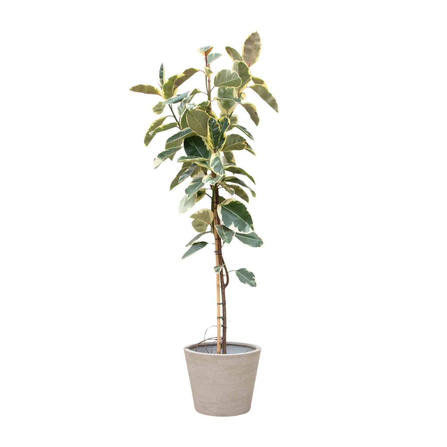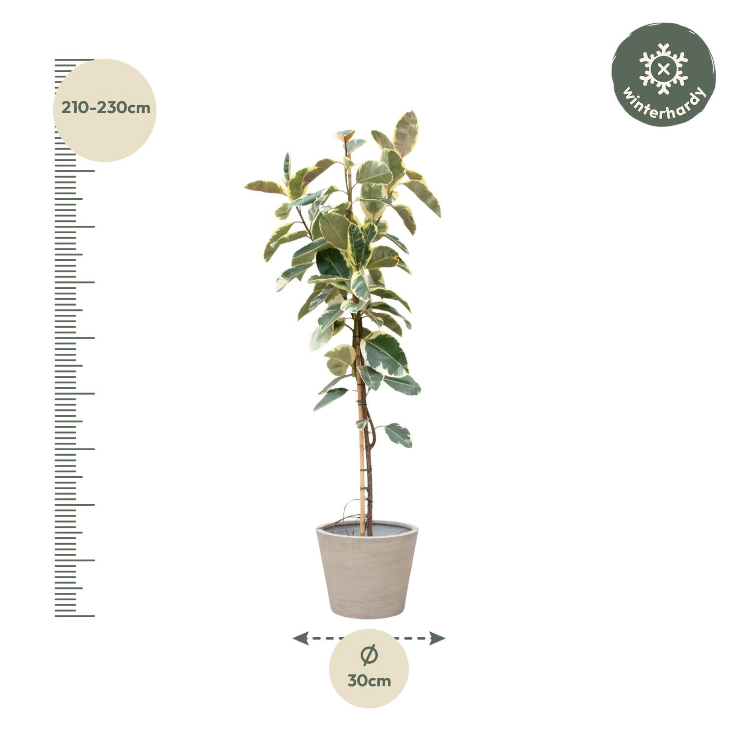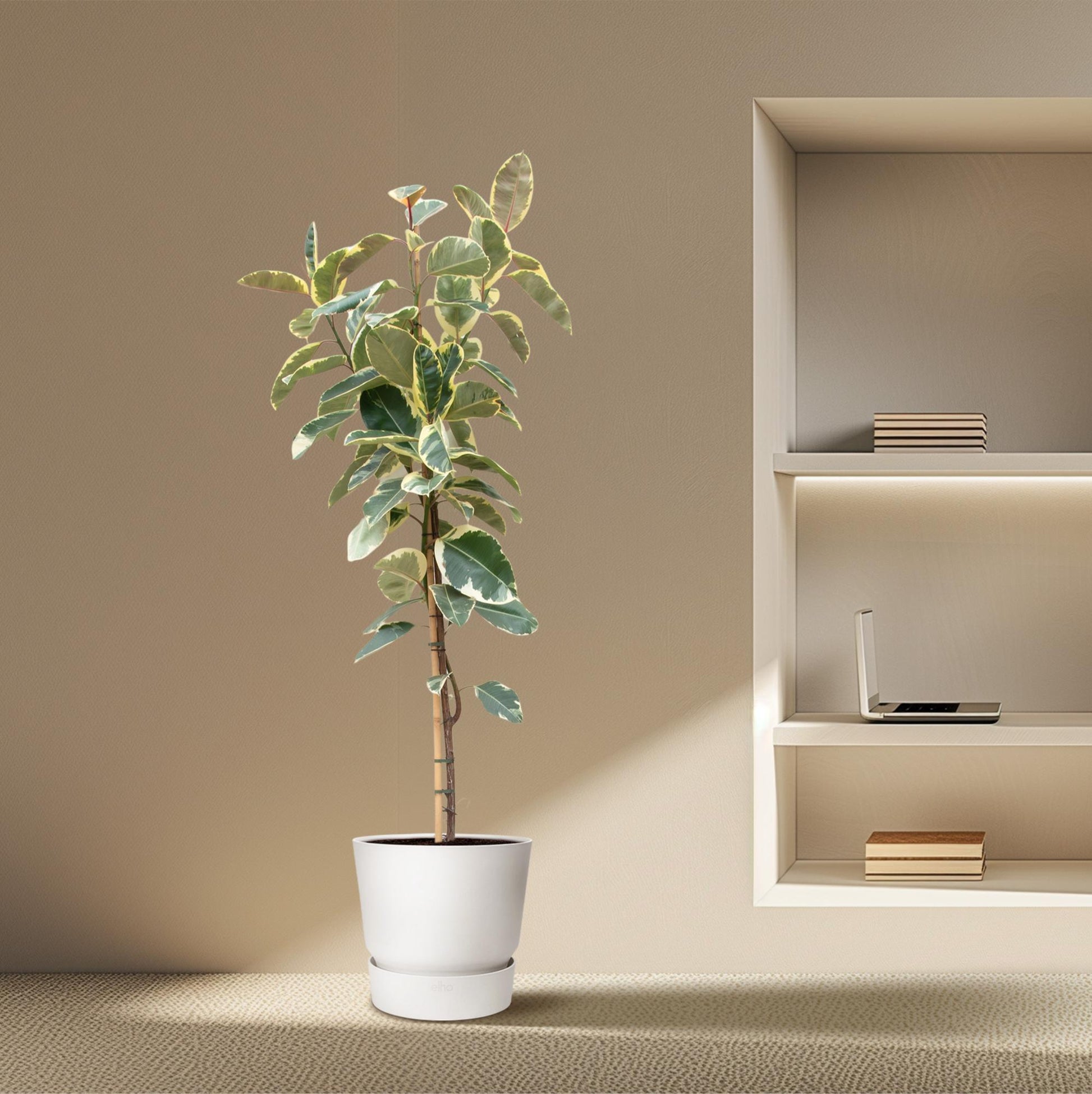 - Aussehen der Pflanze: Die Ficus Tineke auf Stamm hat auffällige, hellgrüne Blätter mit cremefarbenen Rändern und gelegentlich einem Hauch von Rosa. Der Stamm verleiht ihr eine elegante, baumartige Form, ideal als dekorativer Blickfang für den Innenbereich.