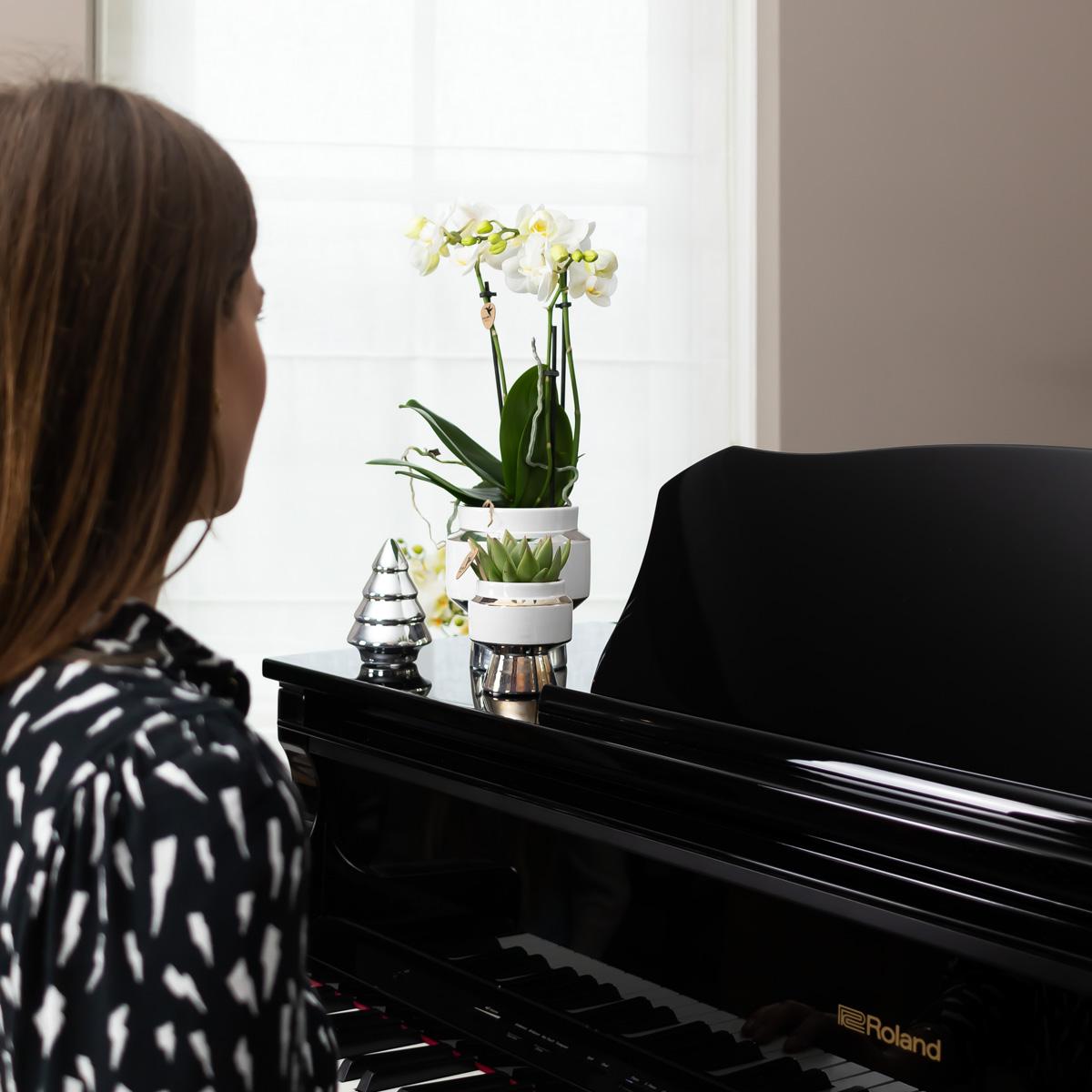 Diese elegante Orchidee in Kombination mit dem Le chic Topf Silber wird Ihrem Wohnzimmer Atmosphäre und Luxus verleihen. Die Orchidee ist an ihren schneeweißen Blüten zu erkennen und bildet 2 bis 3 kräftige Zweige aus. Der Topf ist weiß und an seinen silbernen Details zu erkennen. Der Topf hat eine glatte Oberfläche und eine Topfgröße von 9 cm. Die Pflanze im Topf-Kombination wird in Ihrem Interieur glänzen.