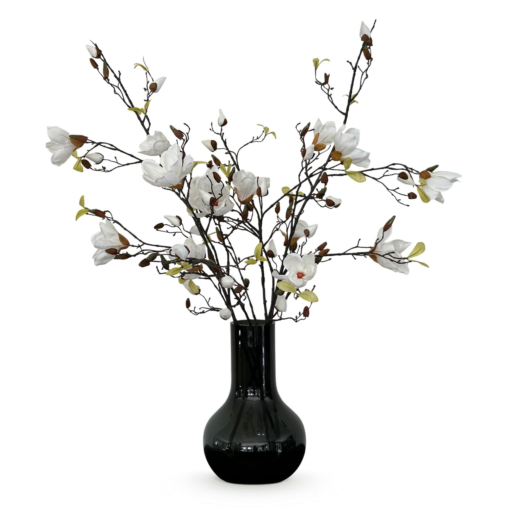 Soms kan het zo simpel zijn. Zet een paar kunst magnolia takken in een bijzondere vaas en je hebt gewoon een kunststukje gecreëerd. Met deze creatie geef je elke ruimte een upgrade! De mooie kunst magnola takken zijn van hele goede kwaliteit en je kunt er jarenlang van genieten. Niemand ziet dat ze niet echt zijn. De kunst magnolia heeft een serene witte kleur die overal past en niet snel verveelt. De takken zijn 105 centimeter lang en je kunt ze afknippen tot elke lengte. Het geeft een leuk speels effect om de kunsttakken in verschillende lengtes te presenteren in een van onze mooie vazen.