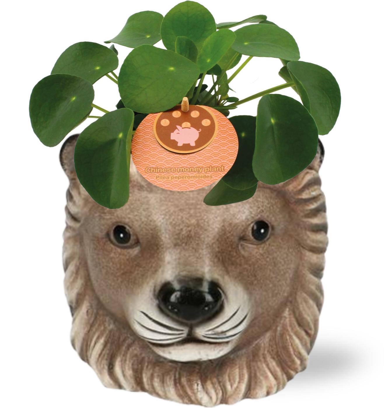 Pilea Peperomioides - Ø11cm - ↕15cm + Planter Leeuw D11/13x10cm - Braun