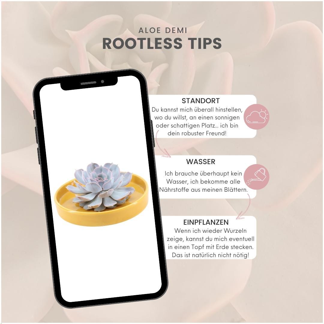 ROOTLESS-Sukkulenten werden in einem Kulturtopf gezüchtet und wachsen auf die richtige Größe heran. Wenn die Rosette der Pflanze groß genug ist, wird sie aus der Blumenerde herausgeschnitten. Andere Bezeichnungen für ROOTLESS sind Schnittfettpflanze, Schnittpflanze, Schnitt-Echeveria und Schnitt-Sukkulente.