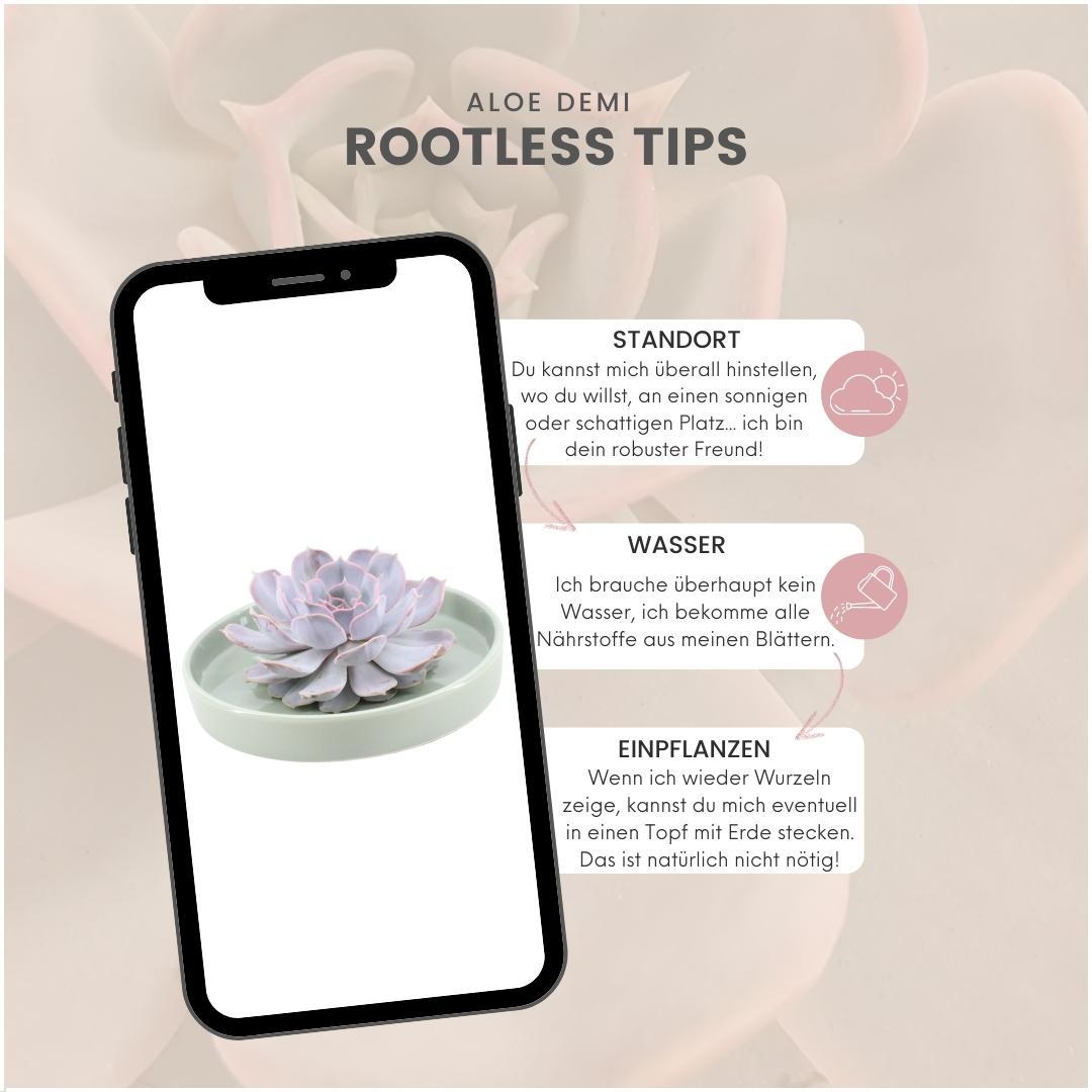 ROOTLESS-Sukkulenten werden in einem Kulturtopf gezüchtet und wachsen auf die richtige Größe heran. Wenn die Rosette der Pflanze groß genug ist, wird sie aus der Blumenerde herausgeschnitten. Andere Bezeichnungen für ROOTLESS sind Schnittfettpflanze, Schnittpflanze, Schnitt-Echeveria und Schnitt-Sukkulente.