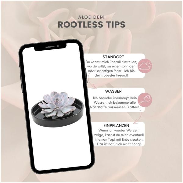 ROOTLESS-Sukkulenten werden in einem Kulturtopf gezüchtet und wachsen auf die richtige Größe heran. Wenn die Rosette der Pflanze groß genug ist, wird sie aus der Blumenerde herausgeschnitten. Andere Bezeichnungen für ROOTLESS sind Schnittfettpflanze, Schnittpflanze, Schnitt-Echeveria und Schnitt-Sukkulente.