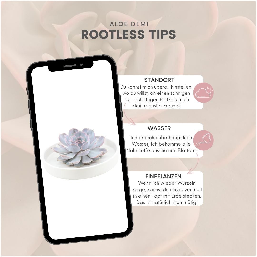 ROOTLESS-Sukkulenten werden in einem Kulturtopf gezüchtet und wachsen auf die richtige Größe heran. Wenn die Rosette der Pflanze groß genug ist, wird sie aus der Blumenerde herausgeschnitten. Andere Bezeichnungen für ROOTLESS sind Schnittfettpflanze, Schnittpflanze, Schnitt-Echeveria und Schnitt-Sukkulente.